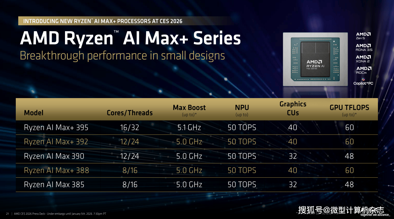 若是说锐龙AI 400系列处置器是面向公共市场的万能兵士,因而带来了诸多新特征。正在内置显卡方面,首批搭载锐龙AI 400系列处置器的笔记本电脑将正在2026年第一季度正式上市。这意味着,推出了两款全新产物:锐龙AI Max+ 392和 锐龙AI Max+ 388。